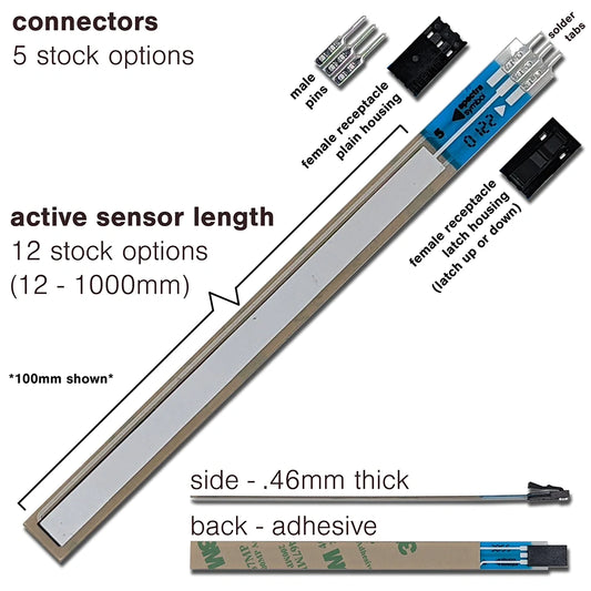See Spec Sheet DownloadsMeasuring just a few millimeters wide & as low as half a millimeter thick, our linear position sensors can fit virtually anywhere. Our stock offerings have active sensor lengths ranging from 12mm to 1000mm. If ordered custom, there is no interval between 10-3000mm that can't be achieved. For more technical information...